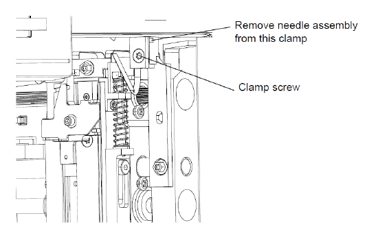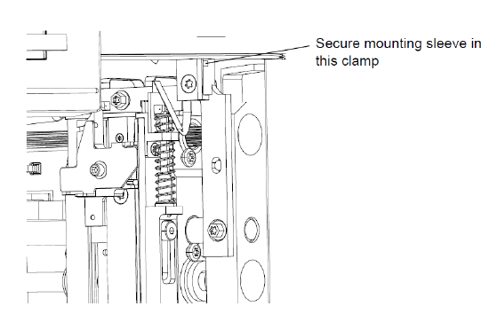 13.双手握住新针装置以控制其在样品室内的位置,将安装套管固定在管路夹的开口中,使得接头朝向阀门。注意:为了避免针装置松动以及损坏针尖的可能,在此步骤中请勿拧紧夹具螺钉。